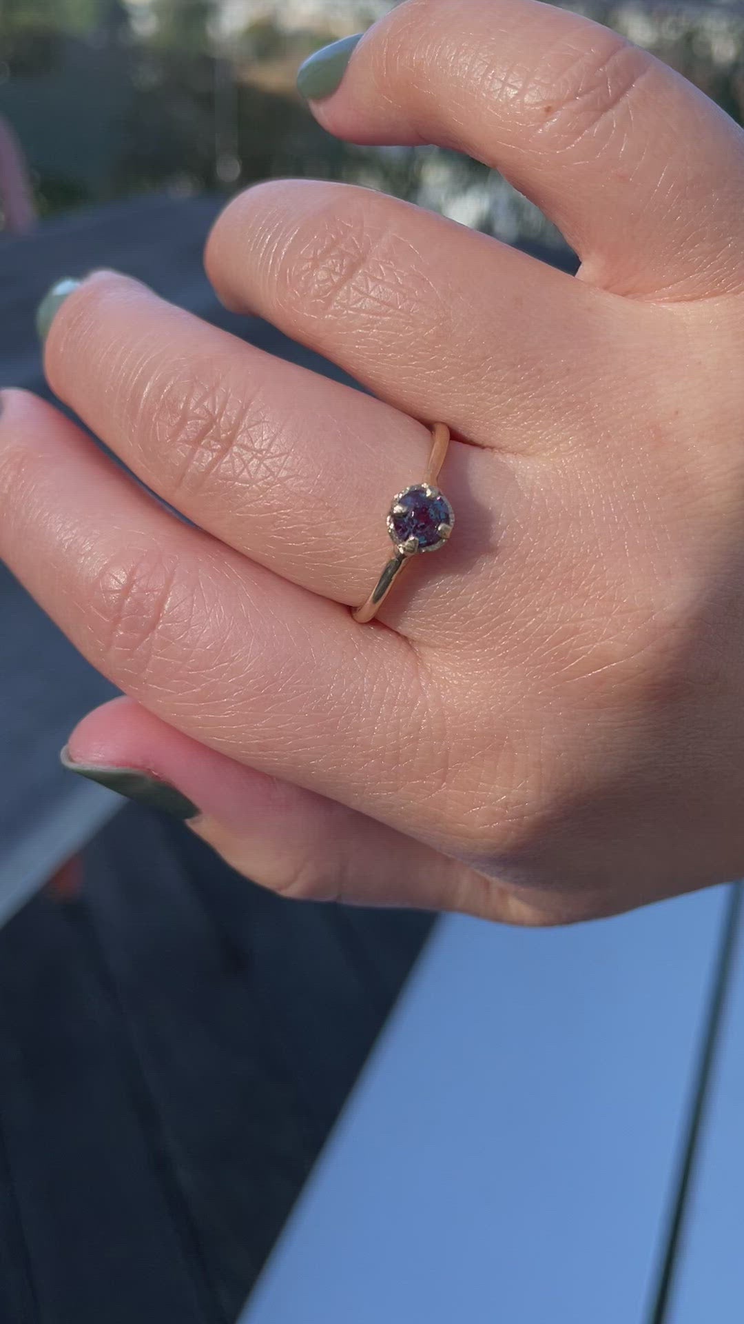 A mysterious ring that glows royal blue in some lights, and teal in others. Featuring an alexandrite in a simple solitaire setting, this ring is perfect for stacking and daily wear. Alexandrite is June's birthstone, and exhibits color changes in different lighting.