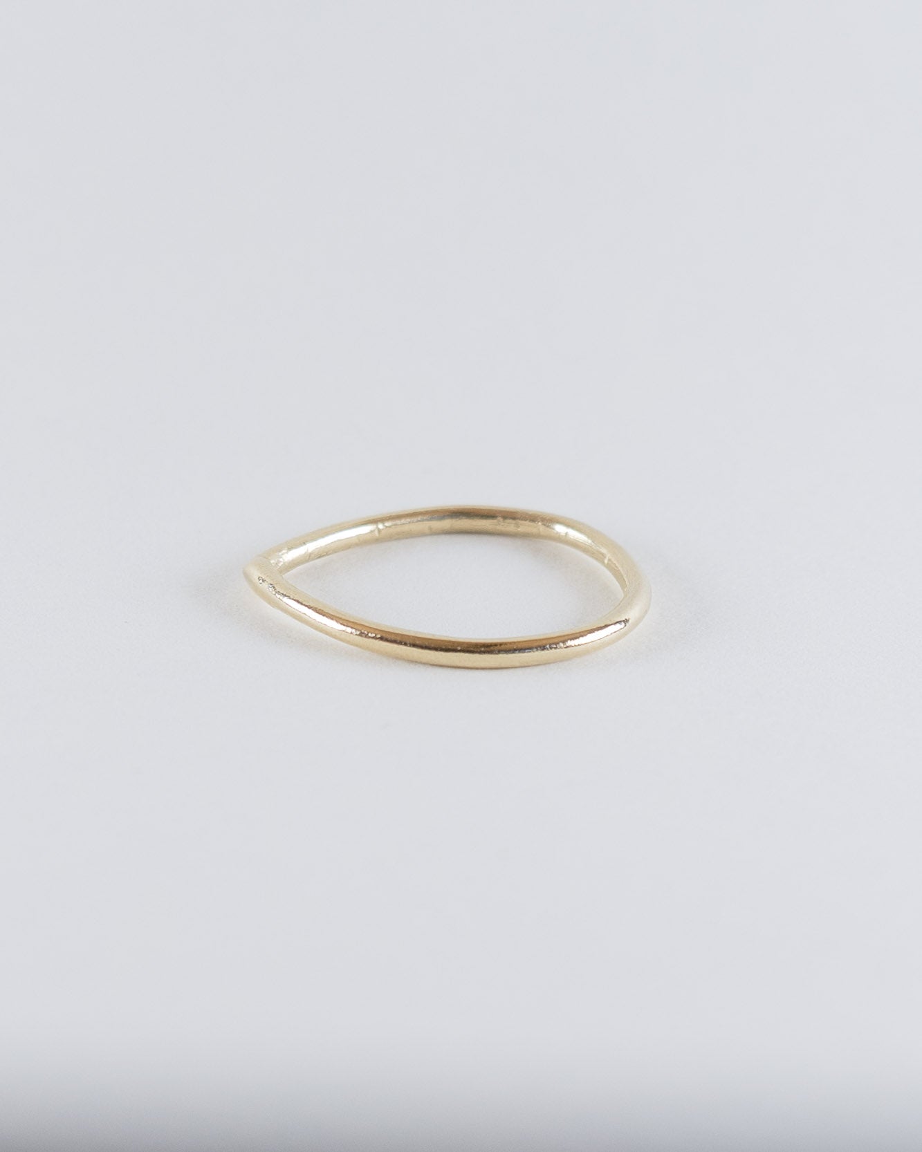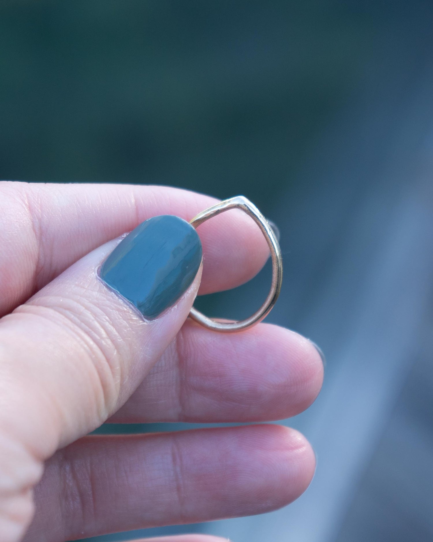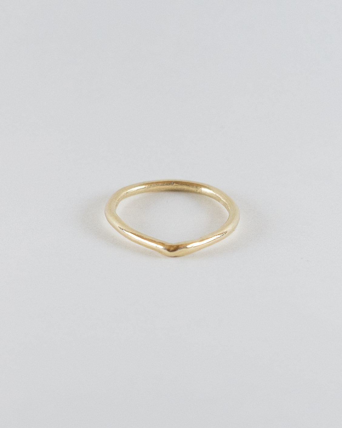 A simple golden ring that's just a bit unexpected, with a peak reminiscent of a ship's bow. Good for stacking and daily wear.