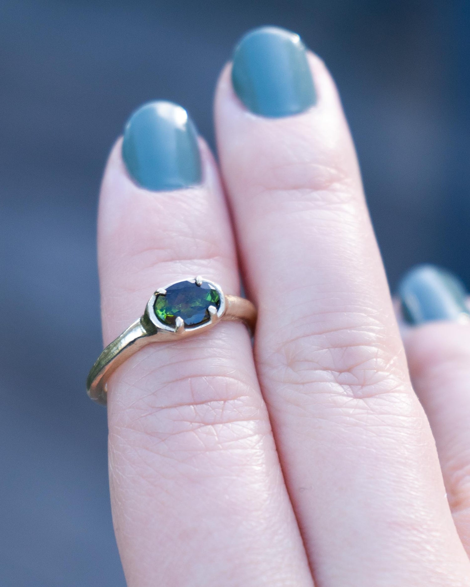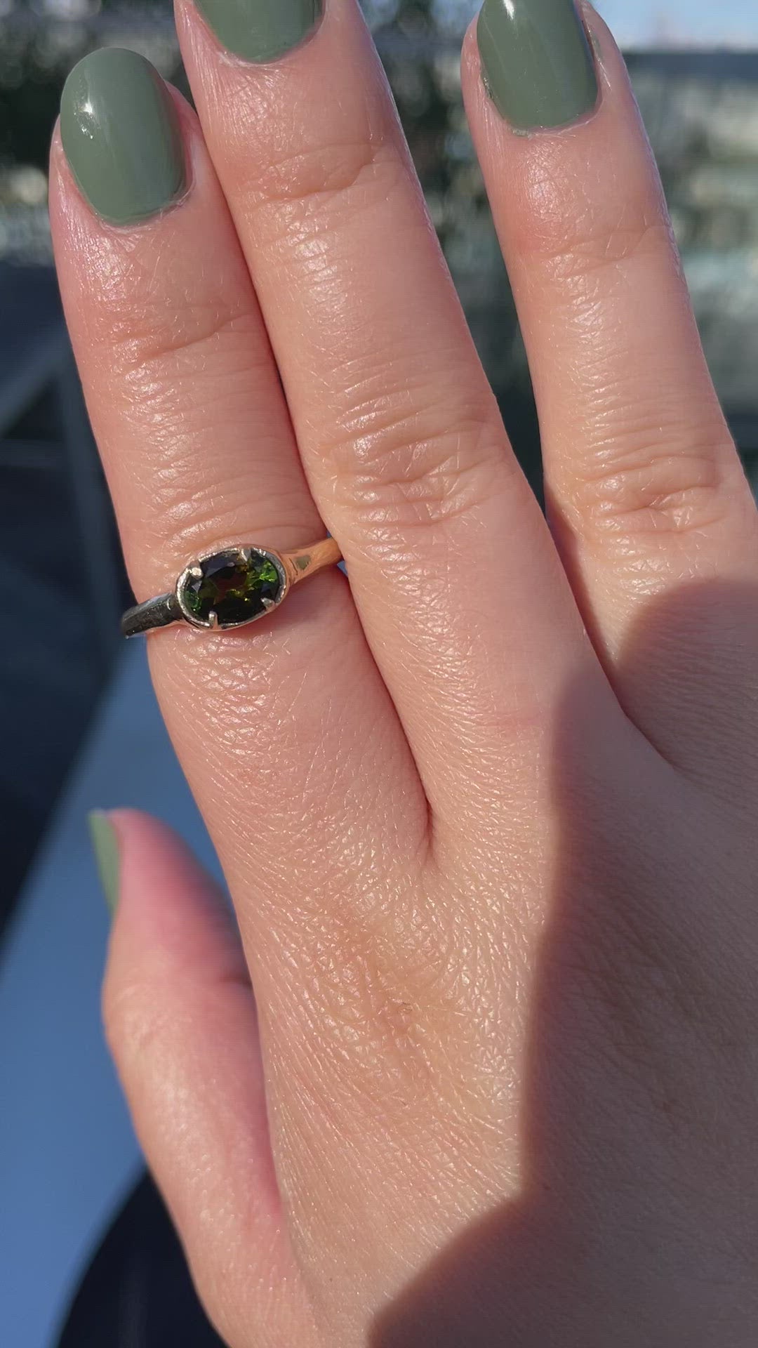 A big beautiful bi-color tourmaline that captures early fall, just as the leaves start to turn. Substantial and androgynous, this ring is bold and smooth like a bracing cup of coffee.